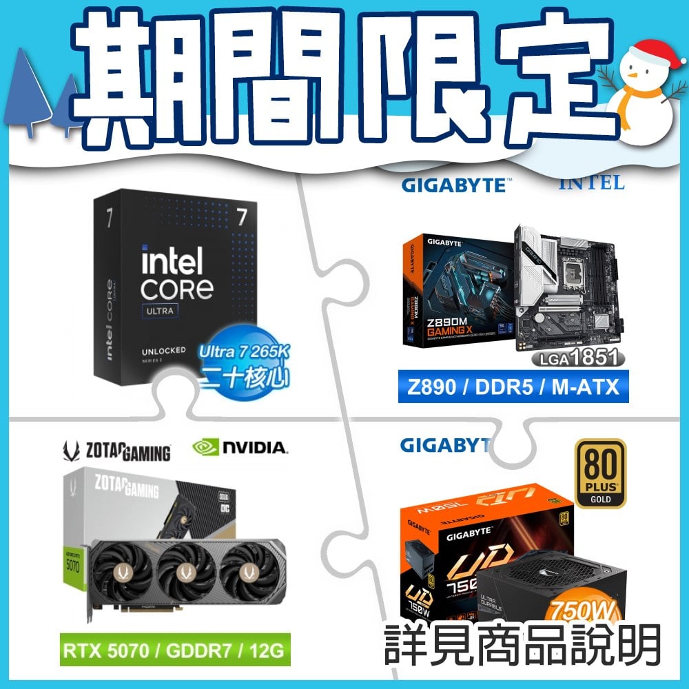 ☆期間限定★ Intel Core Ultra 7 265K+技嘉 Z890M GAMING X D5 MATX主機板+索泰 RTX 5070 SOLID OC 12G 顯示卡+技嘉 UD750GM 金牌 全模組 電源供應器