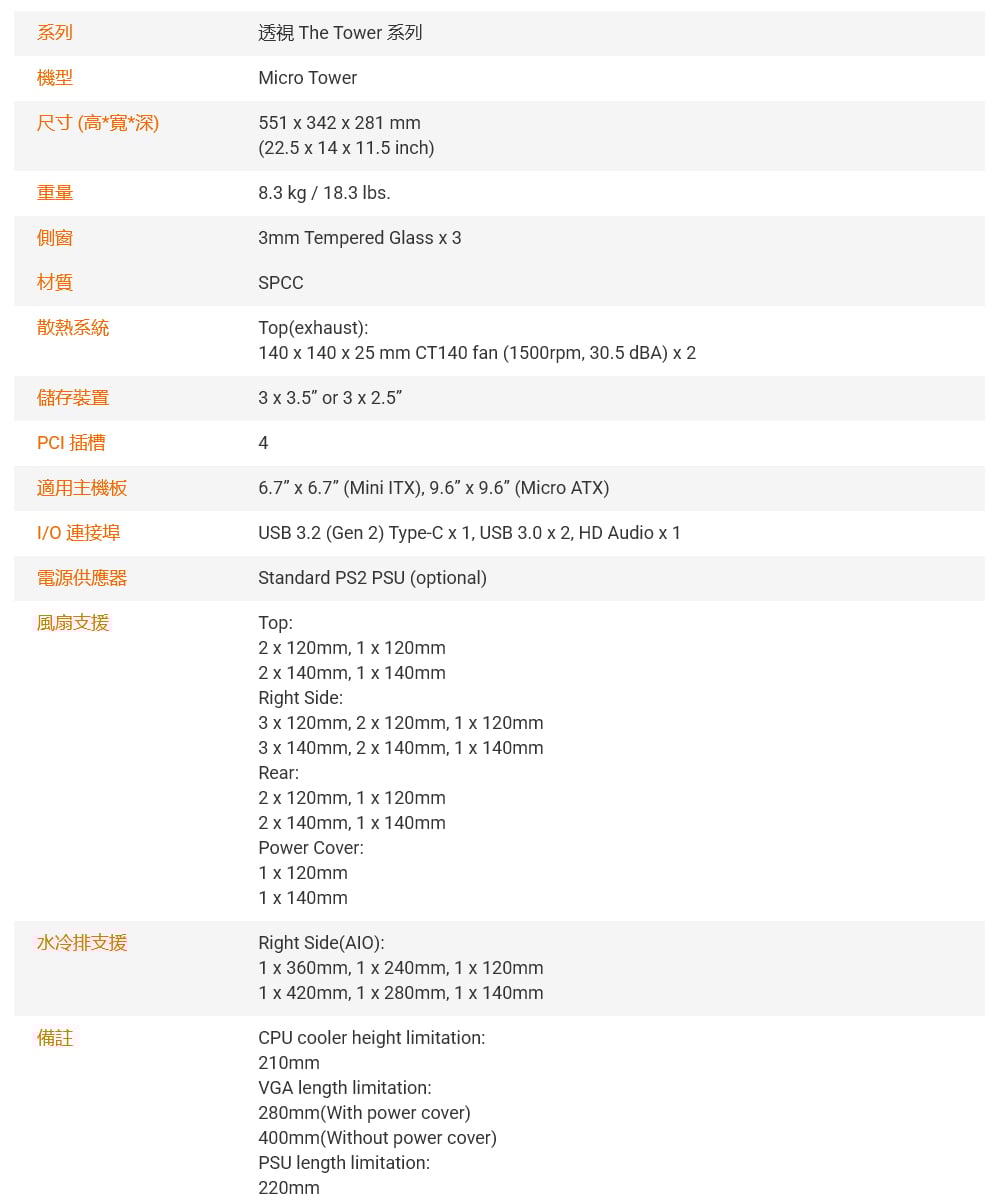 - 預裝兩個140mm CT140風扇