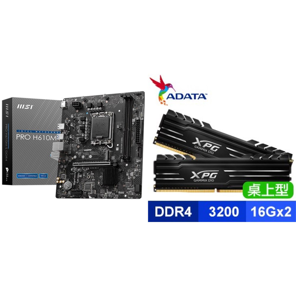 ☆期間限定4★ 微星 PRO H610M-S D4 M-ATX主機板+威剛XPG GAMMIX D10 D4-3200 16G*2記憶體
