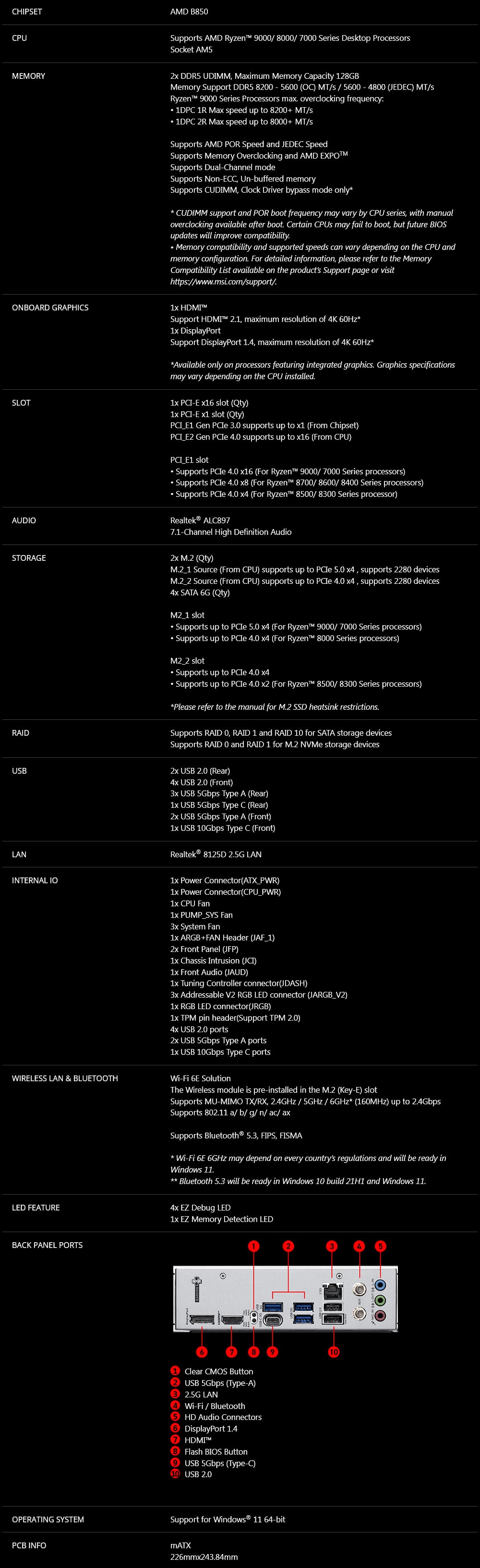 MSI 微星 PRO B850M-A WIFI PZ背插式 AM5主機板(MATX/3+1年保)
