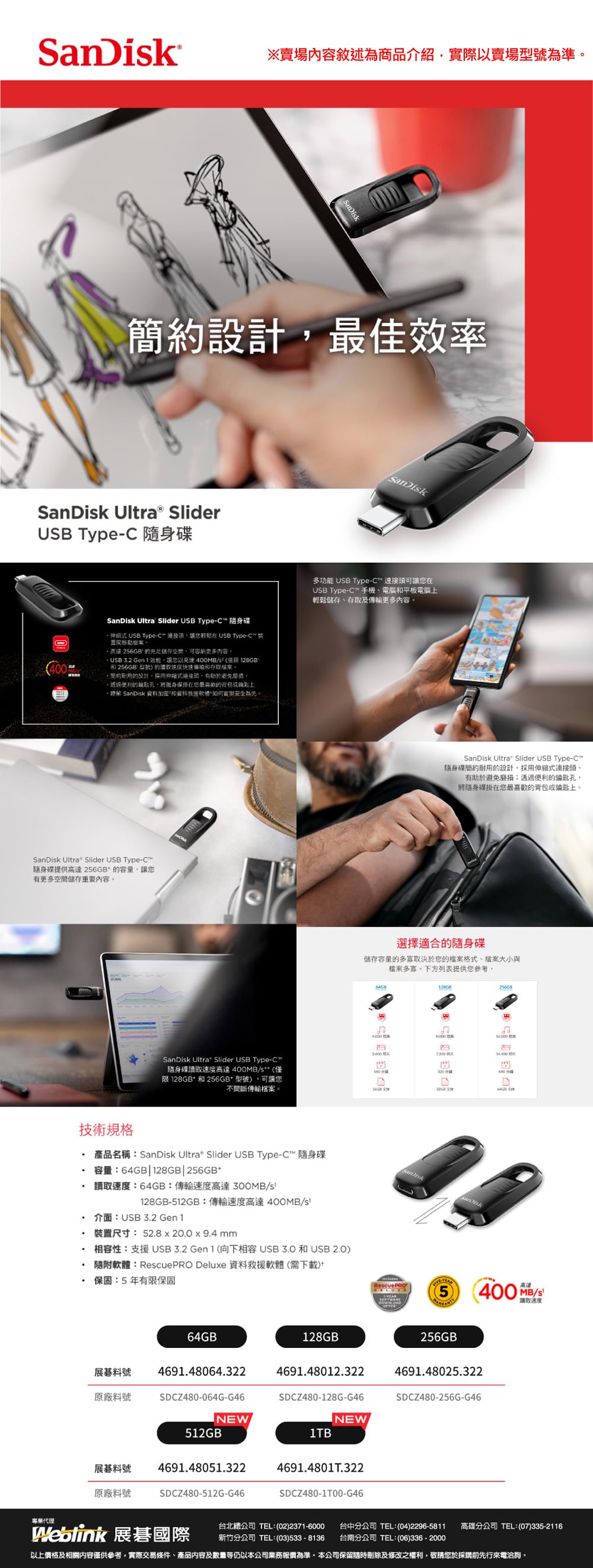SanDisk CZ480 Ultra Slider 1TB Type-C 讀400M U3.2 Gen1隨身碟