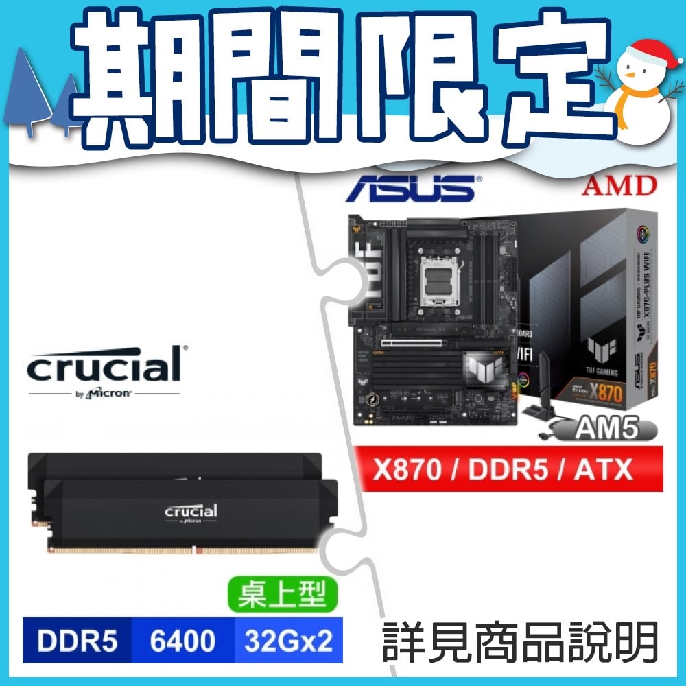 ☆期間限定★ 華碩 TUF GAMING X870-PLUS WIFI ATX主機板+美光 Crucial PRO DDR5 6400 64G (32G*2)CL40 黑 記憶體