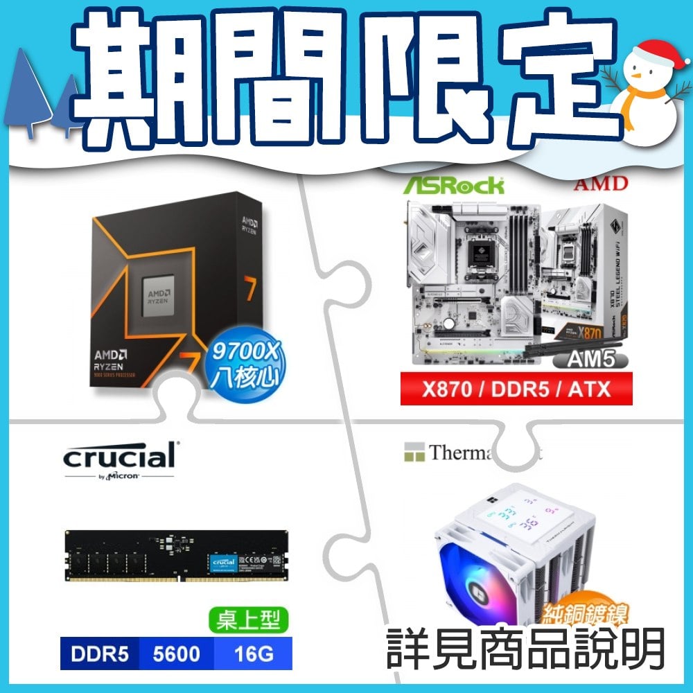 ☆期間限定★ AMD R7 9700X+華擎 X870 Steel Legend WiFi ATX主機板+美光 Crucial DDR5-5600 16G 記憶體+利民 Peerless Assassin 120 數位板 ARGB 白 6導管 245W 雙塔雙風扇 散熱器 高16.2