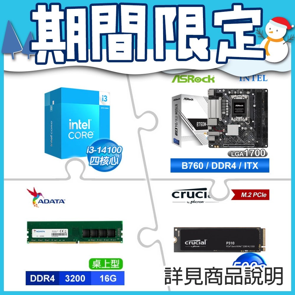 ☆期間限定★ i3-14100+華擎 B760M-ITX D4 WiFi ITX主機板+威剛 DDR4-3200 16G 記憶體+美光 Crucial P310 500G Gen4 M.2 SSD BULK ★送PC-cillin 2025 雲端版 一年一台 隨機版
