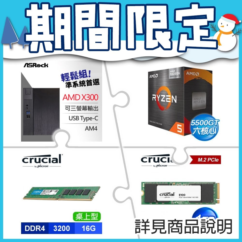 ☆期間限定★ 華擎 DeskMeet X300 AMD準系統+AMD R5 5500GT+美光 Crucial DDR4-3200 16G 記憶體+美光 Crucial E100 1TB M.2 PCIe 4.0 SSD