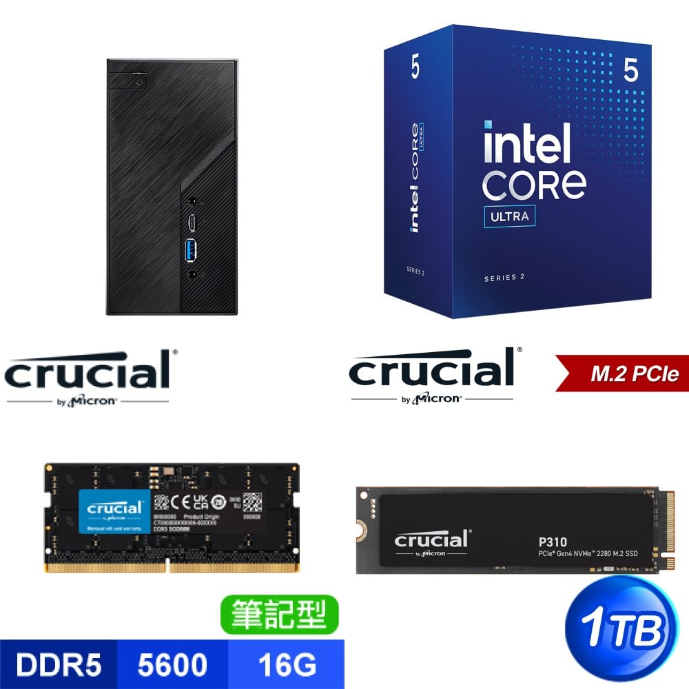 ☆期間限定★ 華擎 DeskMini B860 INTEL迷你準系統+Intel Core Ultra 5 225+美光 Crucial NB DDR5 5600 16G BULK 記憶體+美光 Crucial P310 1TB M.2 SSD BULK ★送Intel AX200 Wi-Fi 6 (Gig+) M.2無線網卡+華擎 DeskMini VESA 後背安裝支架