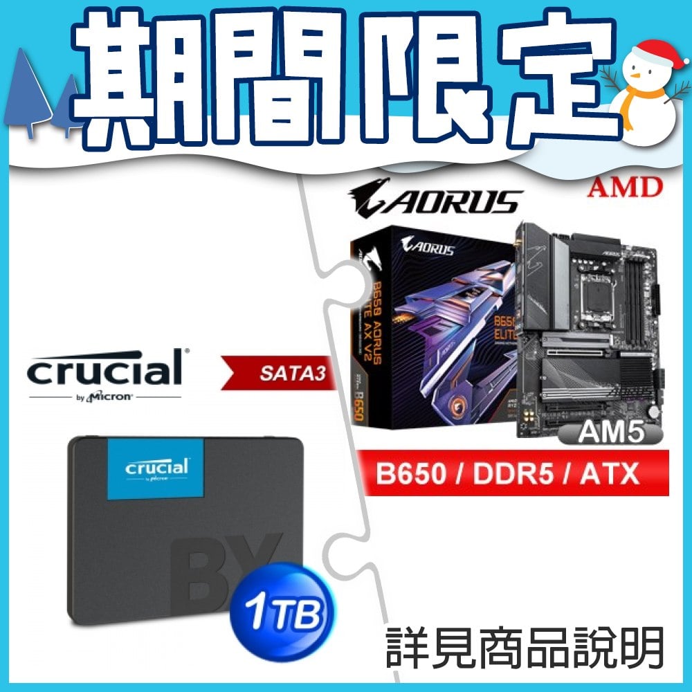 ☆期間限定★ 技嘉 B650 AORUS ELITE AX V2 D5 ATX主機板+美光 Crucial BX500 1TB 7mm 2.5" S3 SSD
