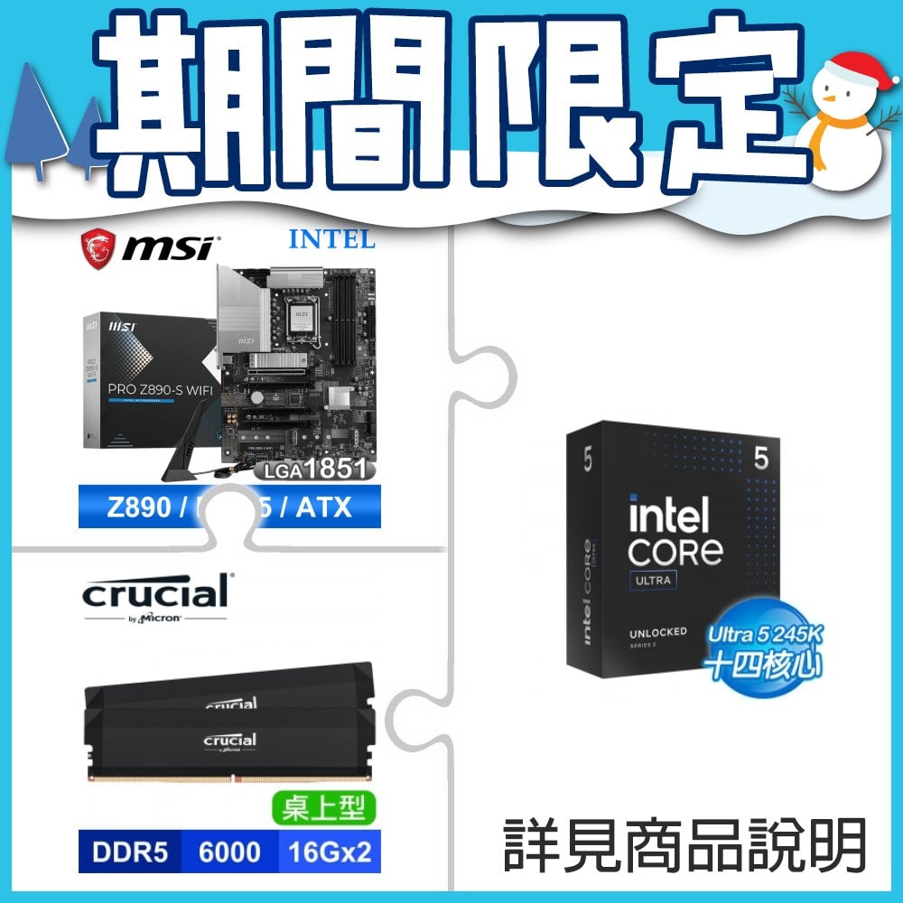 ☆期間限定★ Intel Core Ultra 5 245K+微星 PRO Z890-S WIFI D5 ATX主機板+美光Crucial PRO DDR5-6000 16G*2黑 記憶體 ★送酷碼 EliteLiquid 360 ARGB 水冷散熱器
