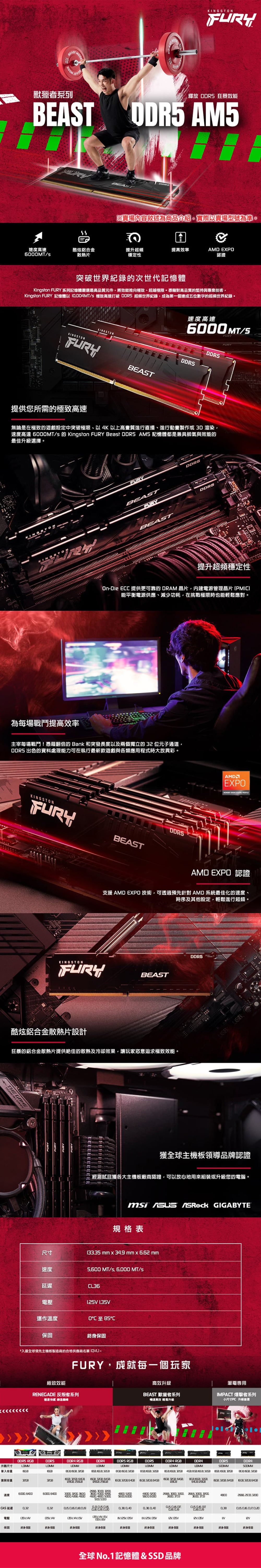 Kingston 金士頓 FURY Beast 獸獵者 DDR5-6000 16G CL30 桌上型記憶體(支援XMP3.0、EXPO)《黑》(KF560C30BBE-16)