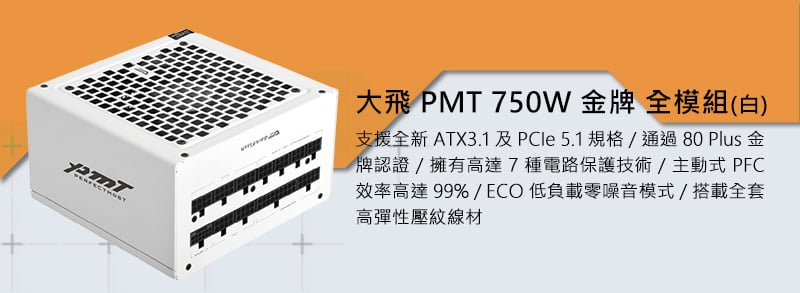 - 電源供應器:大飛 PMT 750W 金牌 全模組 ATX3.1 PCIe 5.1 白