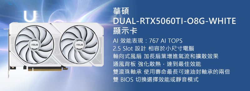 - 顯示卡:華碩 DUAL-RTX5060TI-O8G-WHITE