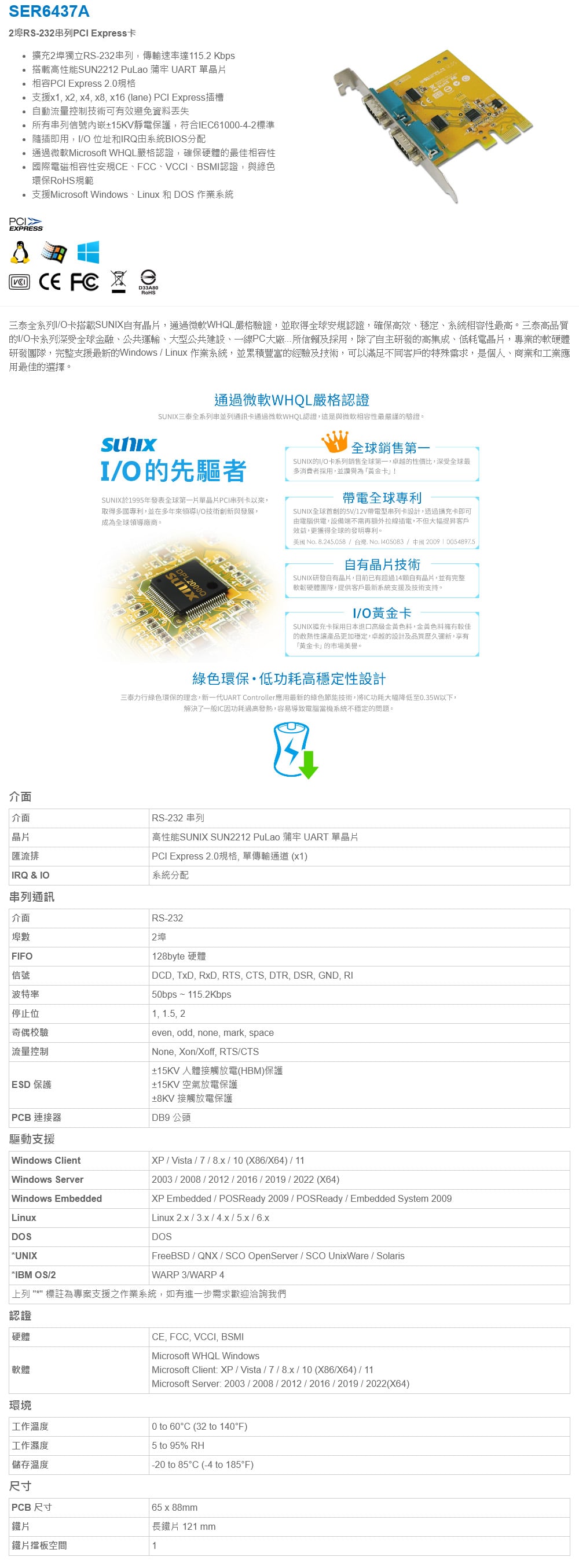 SUNIX 2埠RS-232串列PCI-E擴充卡(SER6437A)