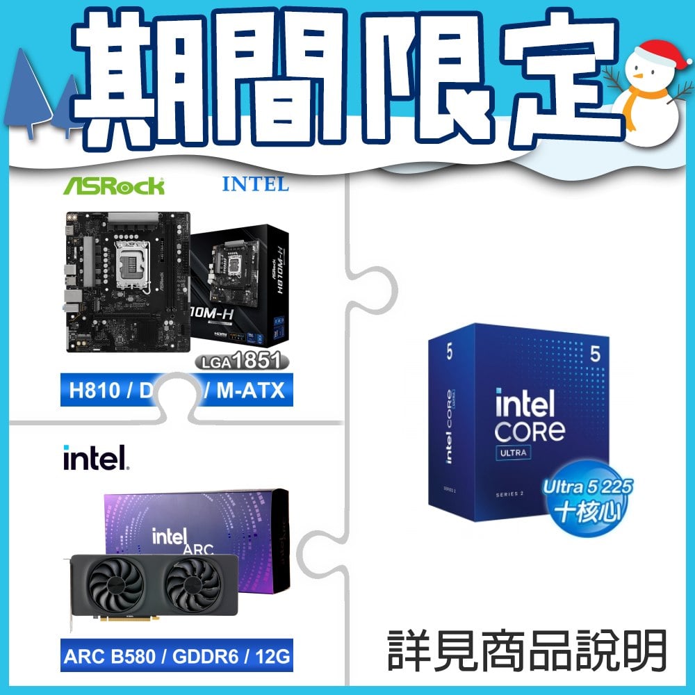 ☆期間限定★ Intel Core Ultra 5 225+華擎 H810M-H MATX 主機板+Intel Arc B580 12G 20 Core 顯示卡
