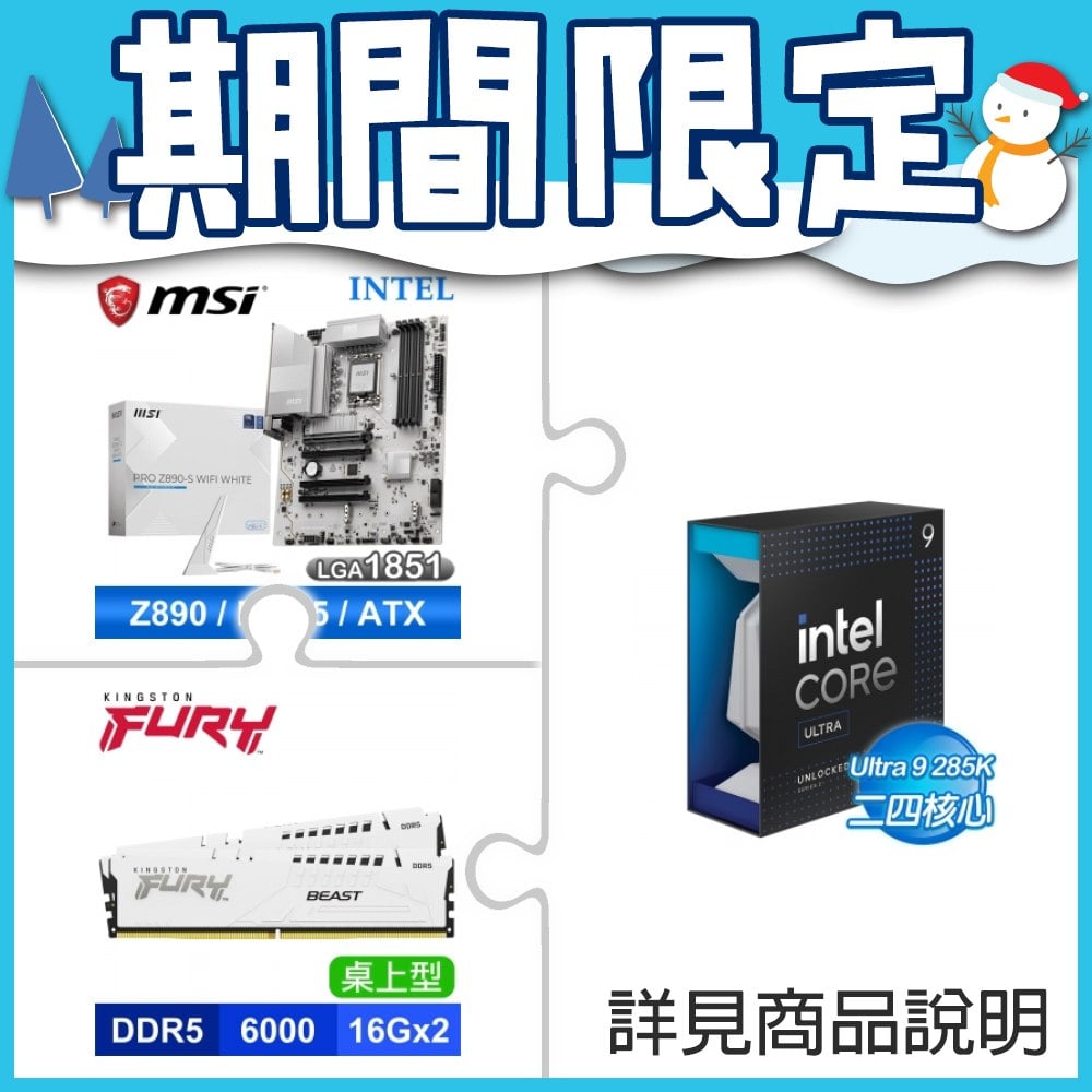 ☆期間限定★ Intel Core Ultra 9 285K+微星 PRO Z890-S WIFI WHITE D5 ATX主機板+金士頓 獸獵者 D5 6000 16G*2 CL30 白 記憶體 ★送酷碼 EliteLiquid 360 ARGB 水冷散熱器