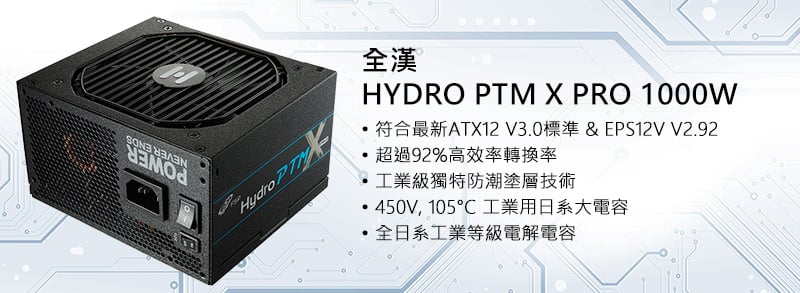 - 電源供應器:全漢 HYDRO PTM X PRO 1000W 白金牌 全模組