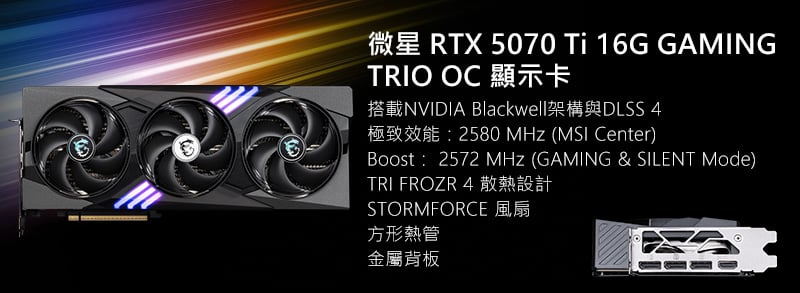- 顯示卡:微星 RTX 5070 Ti 16G GAMING TRIO OC