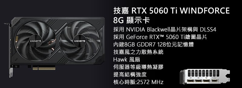 - 顯示卡:技嘉 RTX 5060 Ti WINDFORCE 8G