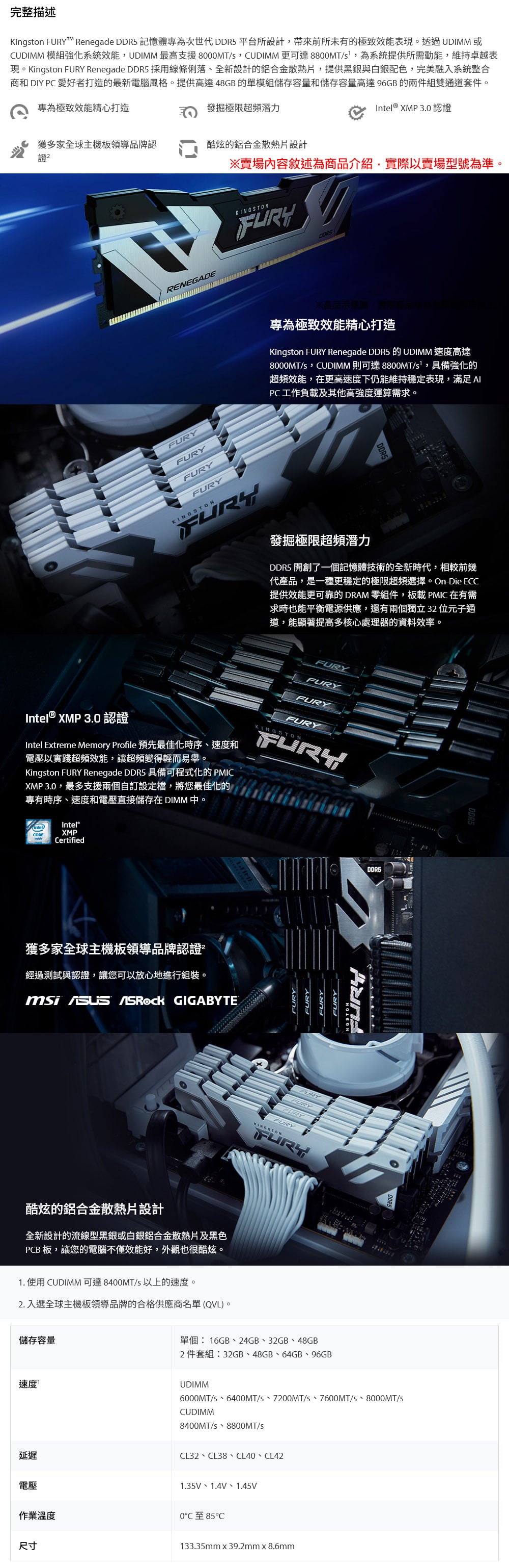 Kingston 金士頓 FURY Renegade 反叛者 DDR5-8400 24G 桌上型記憶體《黑》(KF584CU40RS-24)