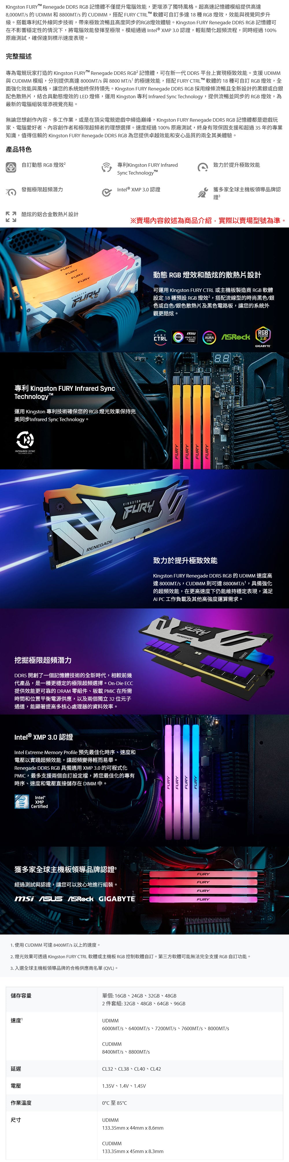 Kingston 金士頓 FURY Renegade RGB 反叛者 DDR5-8400 24G 桌上型記憶體《白》(KF584CU40RWA-24)