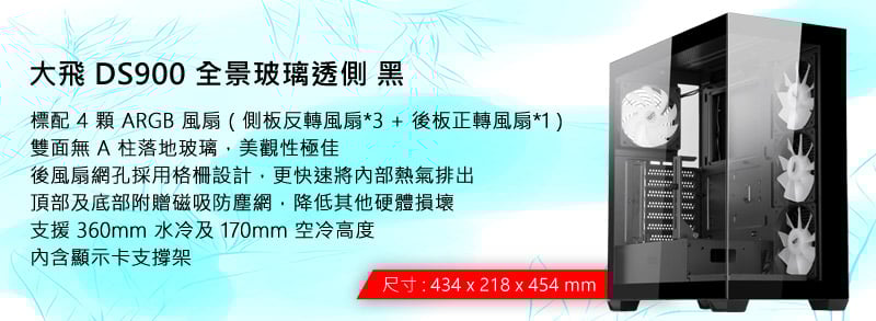 - 電腦機殼:大飛 DS900 全景玻璃透側 ATX 黑