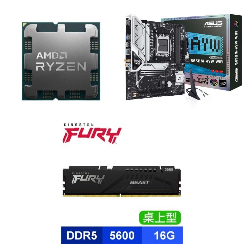 ☆期間限定★ AMD R7 7700 MPK SR1+華碩 B650M-AYW WIFI M-ATX主機板+金士頓 獸獵者 D5 5600 16G CL36 黑 記憶體