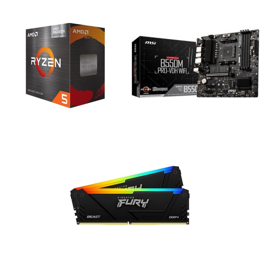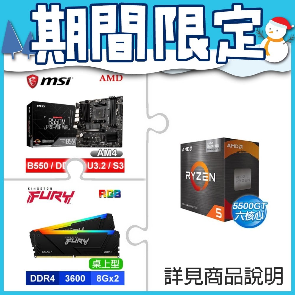 ☆期間限定★ AMD R5 5500GT+微星 B550M PRO-VDH WIFI M-ATX主機板+金士頓 RGB 獸獵者 D4 3600 8G*2 CL17 黑 記憶體