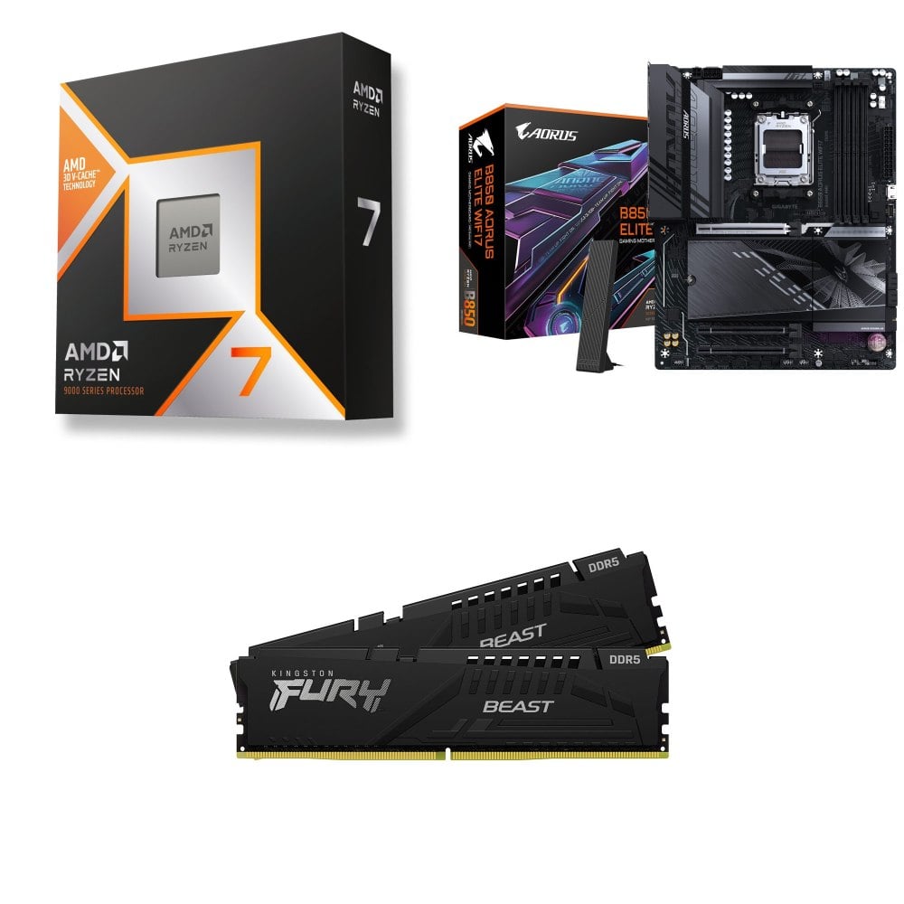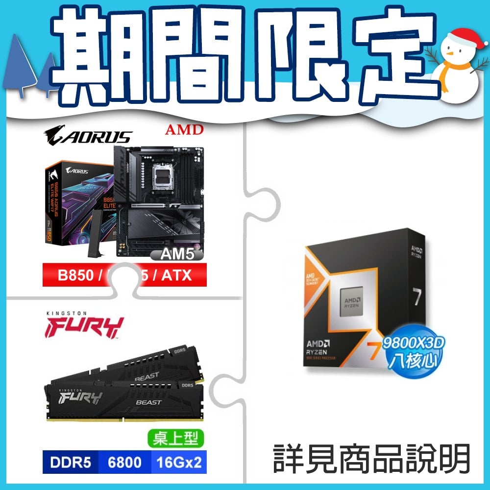 ☆期間限定★ AMD R7 9800X3D+技嘉 B850 AORUS ELITE WIFI7 ATX主機板+金士頓 獸獵者 D5 6800 16G*2 CL34 黑 記憶體