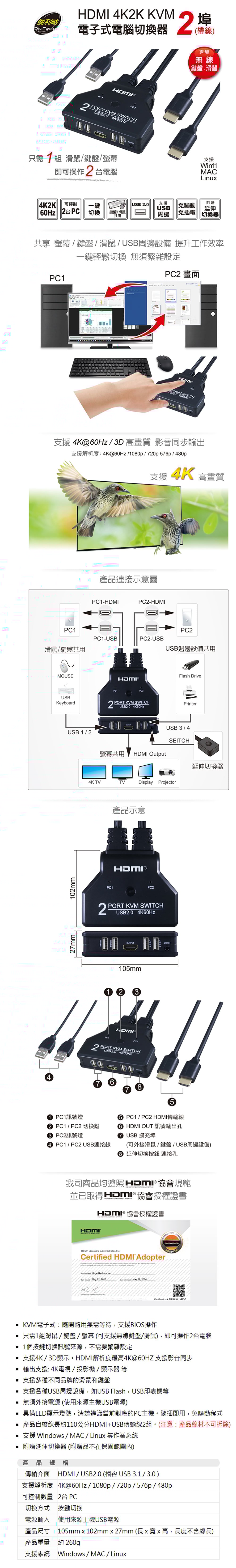 伽利略 HDMI 4K2K KVM電子式電腦切換器2埠(HKVM2SH)