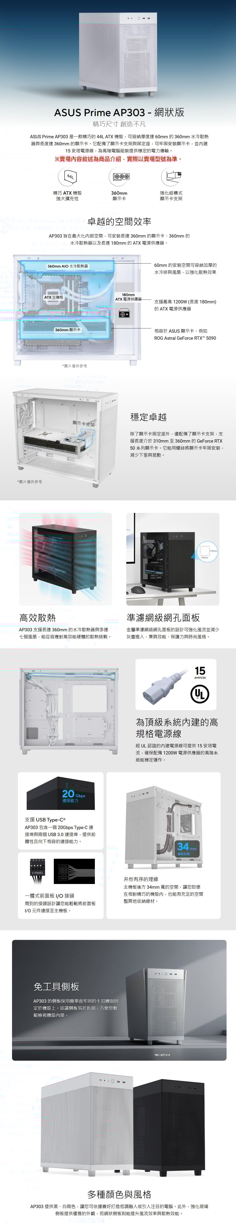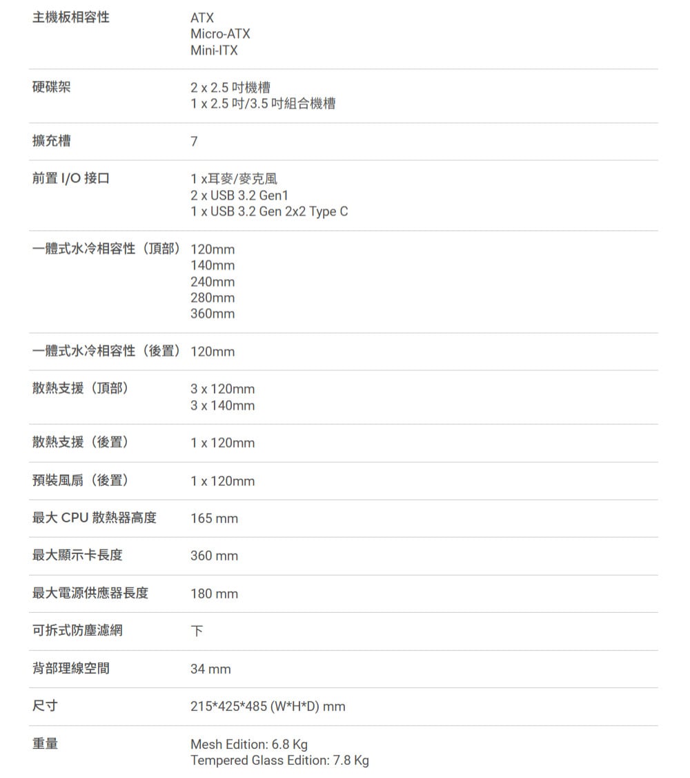 - 精巧尺寸,強大擴充性:在 44 公升的精巧機身中,可容納長達 360mm 的顯示卡、360mm 的水冷(厚度上限 60mm)以及 180mm 的 ATX 電源供應器