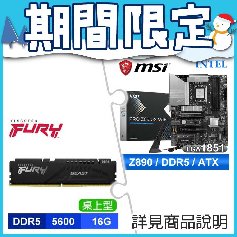 ☆期間限定★ 微星 PRO Z890-S WIFI D5 ATX主機板+金士頓 獸獵者 D5 5600 16G CL36 黑 記憶體
