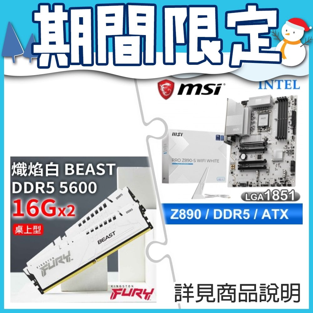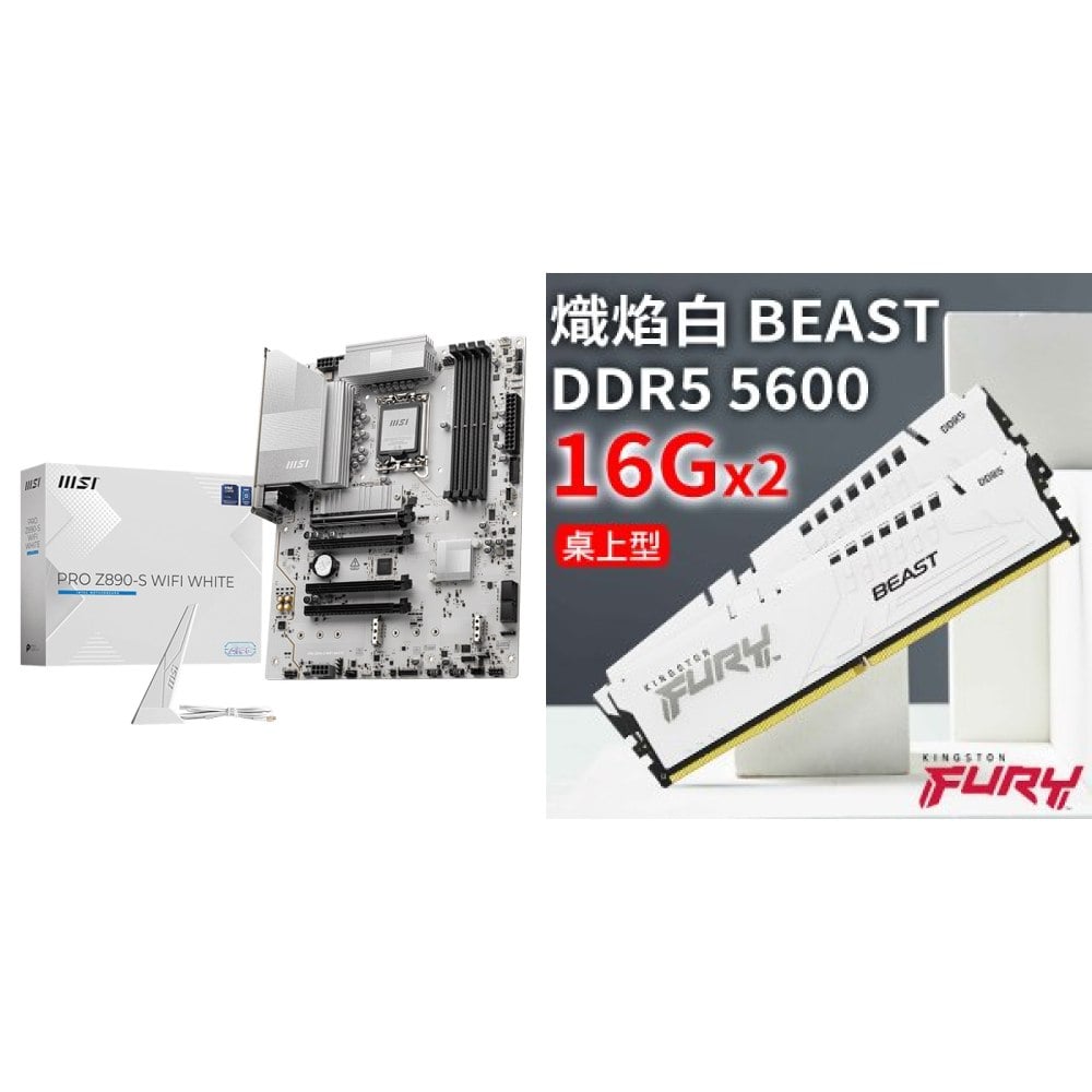 ☆期間限定★ 微星 PRO Z890-S WIFI WHITE D5 ATX主機板+金士頓 獸獵者 D5 5600 16G*2 CL36 白 記憶體