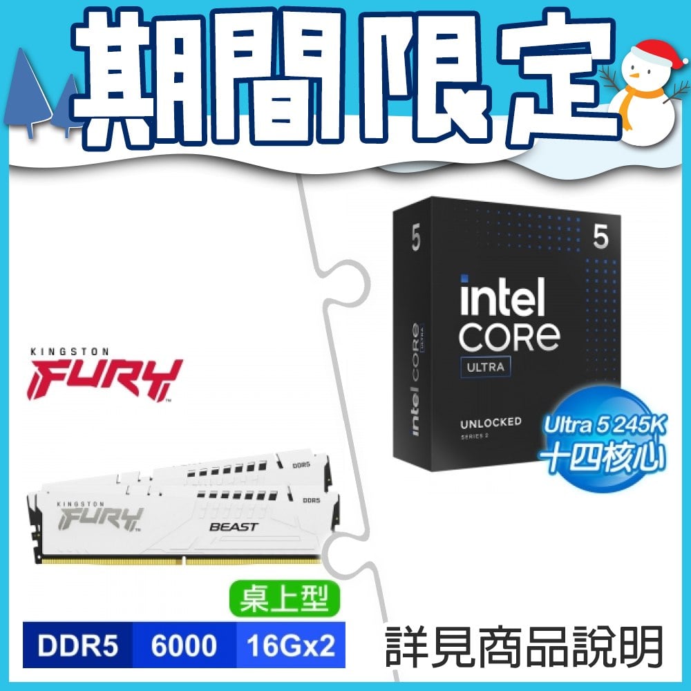 ☆期間限定★ Intel Core Ultra 5 245K+金士頓 獸獵者 D5 6000 16G*2 CL30 白 記憶體
