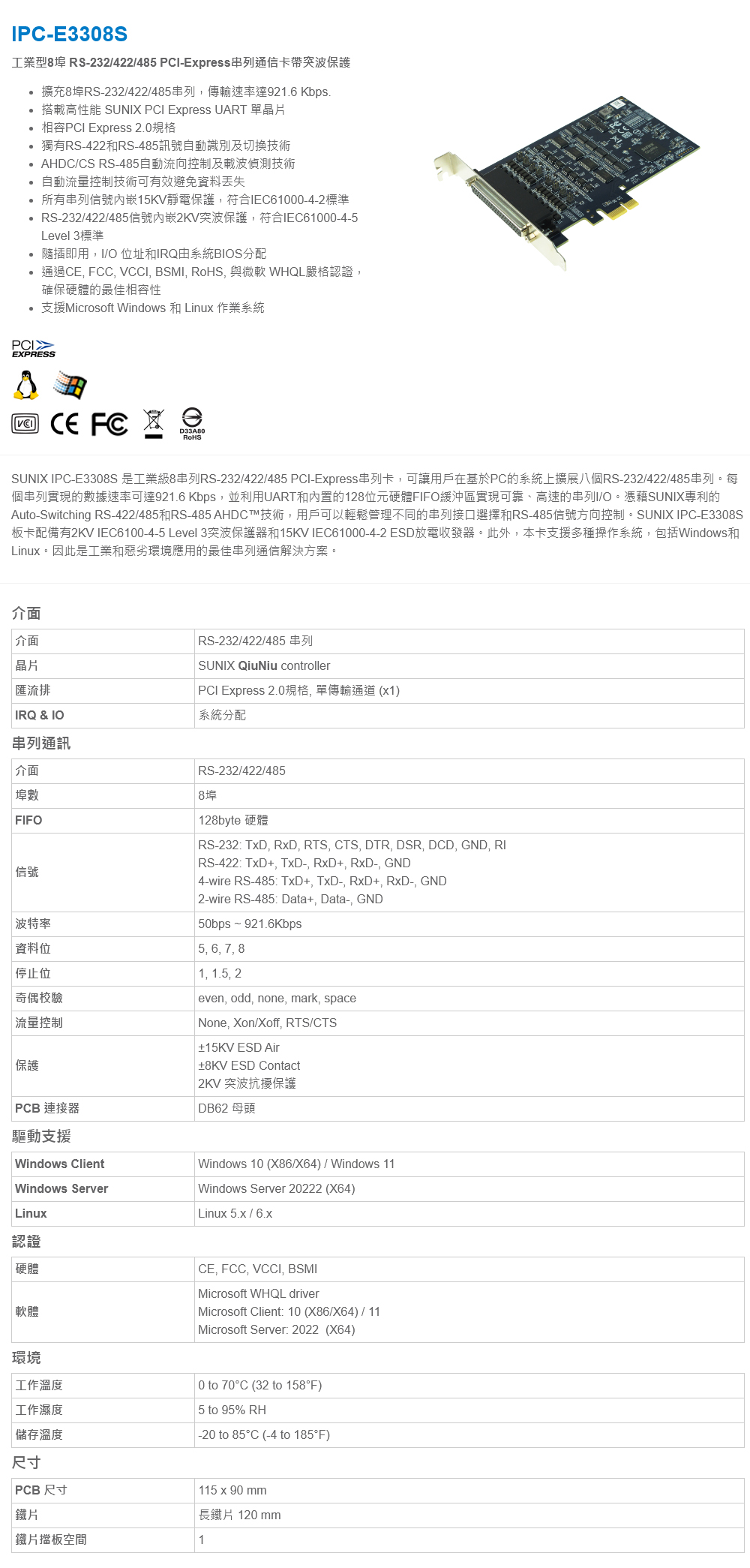 SUNIX 工業型8埠 RS-232/422/485 PCI-E擴充卡(IPC-E3308)