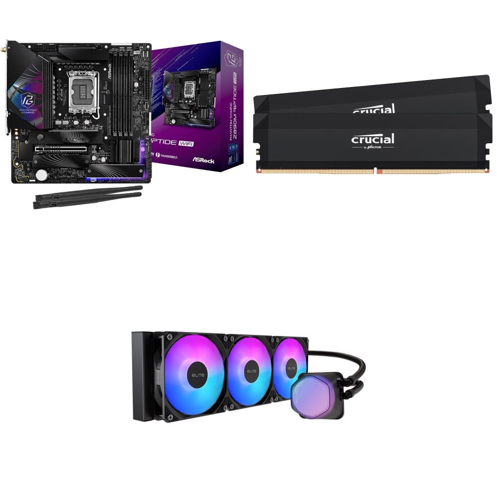 ☆期間限定★ 華擎 Z890M Riptide WiFi D5 M-ATX主機板+美光Crucial PRO DDR5-6000 16G*2黑 記憶體+酷碼 EliteLiquid 360 ARGB 水冷散熱器
