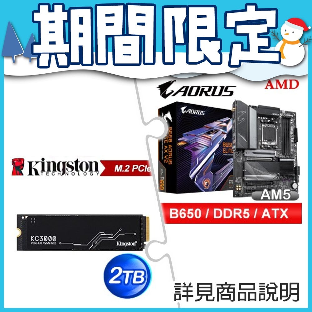 ☆期間限定★ 技嘉 B650 AORUS ELITE AX V2 D5 ATX主機板+金士頓 KC3000 2TB M.2 PCIe 4.0 SSD