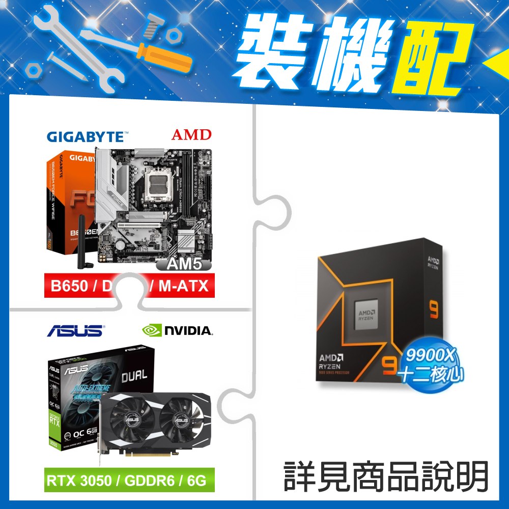 ☆裝機配★ AMD R9 9900X+技嘉 B650EM FORCE WIFI6E MATX主機板+華碩 DUAL-RTX3050-O6G 顯示卡