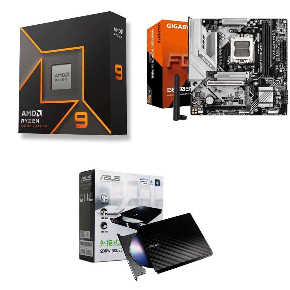 ☆裝機配★ AMD R9 9950X+技嘉 B650EM FORCE WIFI6E MATX主機板+華碩 SDRW-08D2S-U 外接式燒錄機《黑》