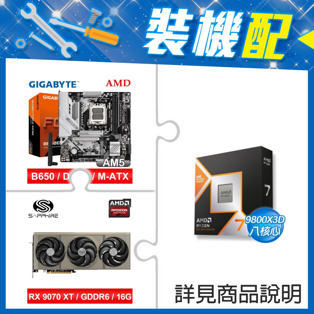 ☆裝機配★ AMD R7 9800X3D+技嘉 B650EM FORCE WIFI6E MATX主機板+藍寶石 PURE 極地 RX 9070 XT GAMING OC 16GB 顯示卡