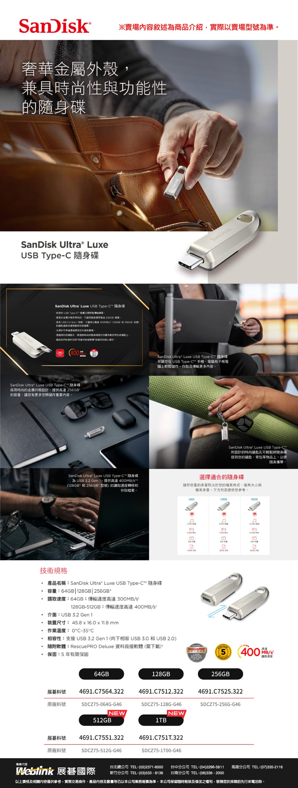 SanDisk CZ75 Ultra Luxe 1TB Type-C 讀400M U3.2 Gen1隨身碟