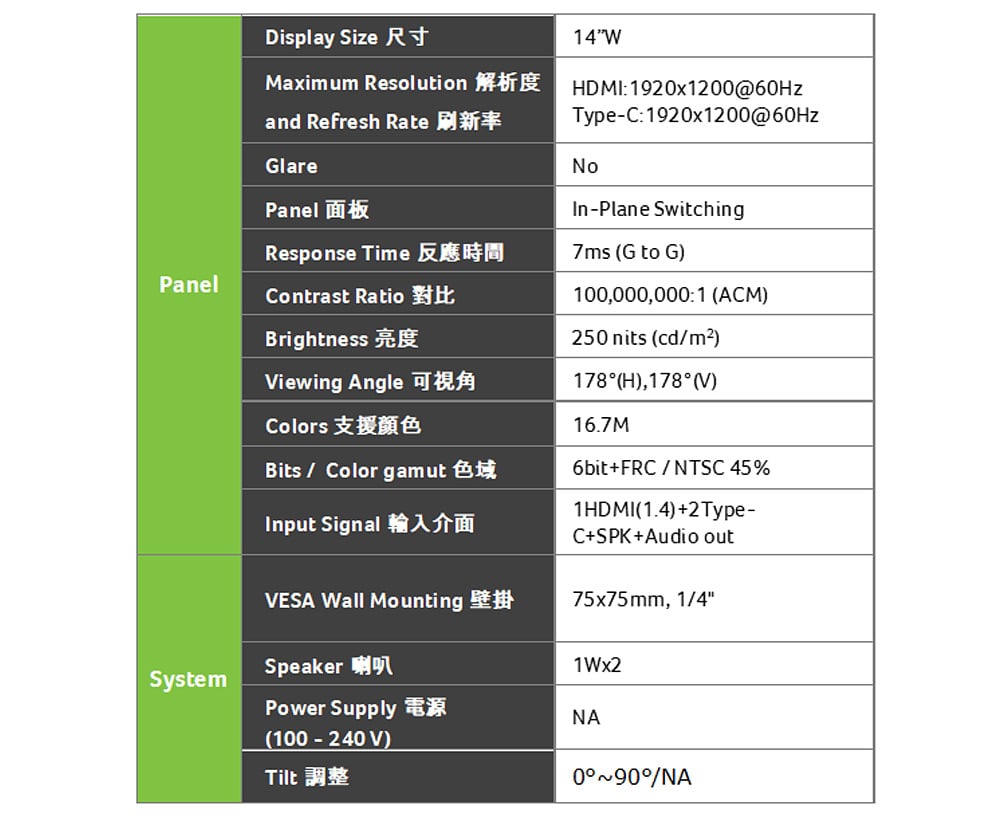 - HDMI:1920x1200@60Hz Type-C:1920x1200@60Hz
