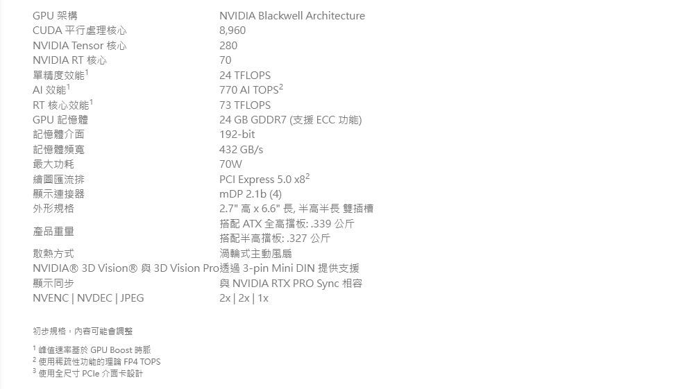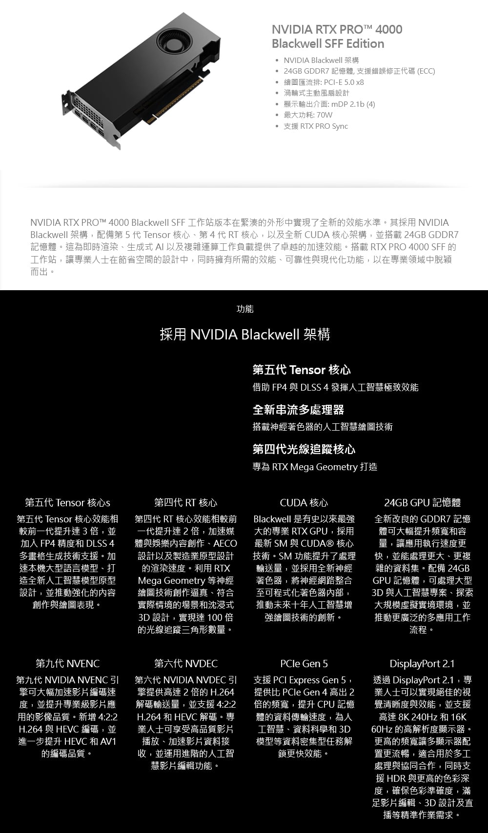 - 24GB GDDR7 記憶體, 支援錯誤修正代碼 (ECC)