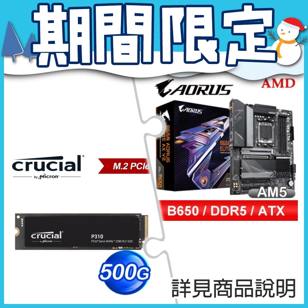 ☆期間限定★ 技嘉 B650 AORUS ELITE AX V2 D5 ATX主機板+美光 Crucial P310 500G Gen4 M.2 SSD BULK