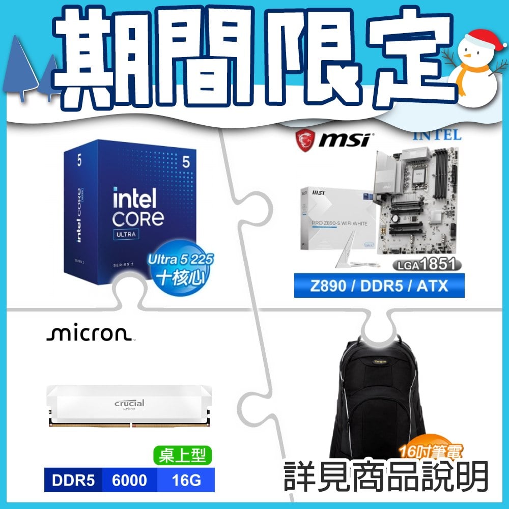 ☆期間限定★ Intel Core Ultra 5 225+微星 PRO Z890-S WIFI WHITE D5 ATX主機板+美光 Crucial PRO DDR5 6000 16G CL36 白 記憶體(X2)★送Targus 16"後背包