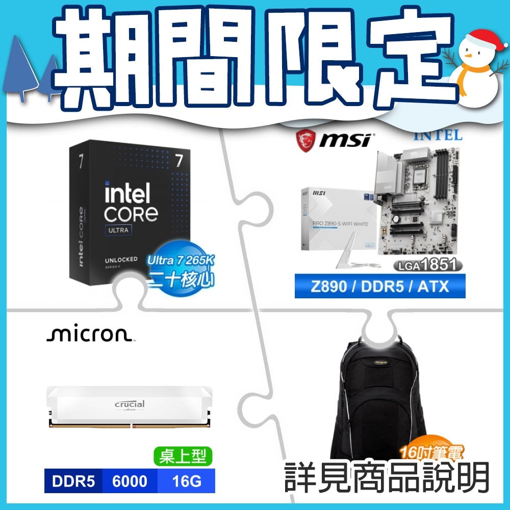 ☆期間限定★ Intel Core Ultra 7 265K+微星 PRO Z890-S WIFI WHITE D5 ATX主機板+美光 Crucial PRO DDR5 6000 16G CL36 白 記憶體(X2) ★送Targus 16"後背包