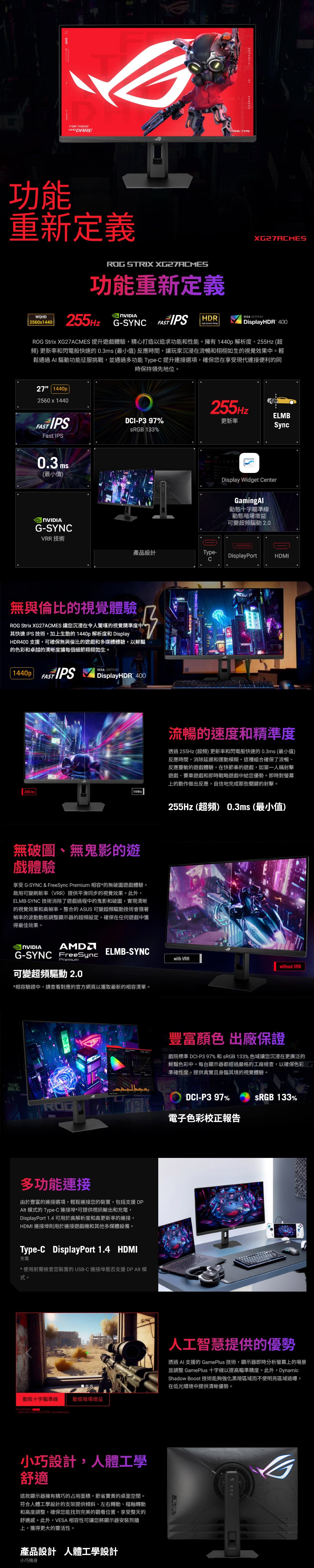 - 27 吋 2560 x 1440 HDR 電競螢幕,搭載極快 255Hz (超頻) 更新率,專為職業玩家和沈浸式遊戲所設計