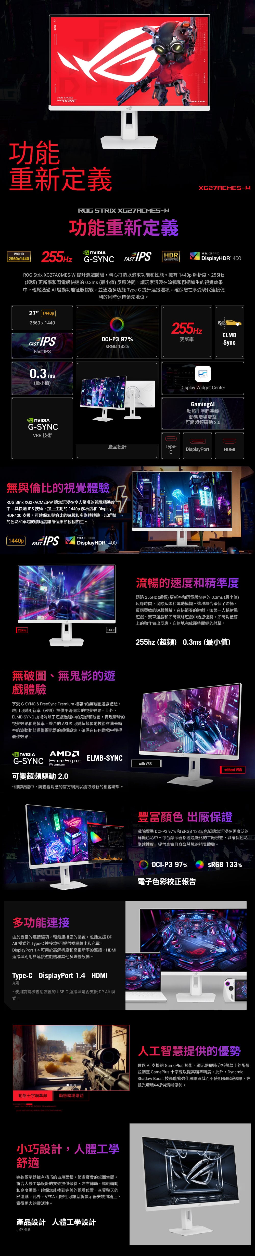 - 27 吋 2560 x 1440 HDR 電競螢幕,搭載極快 255Hz (超頻) 更新率,專為職業玩家和沈浸式遊戲所設計