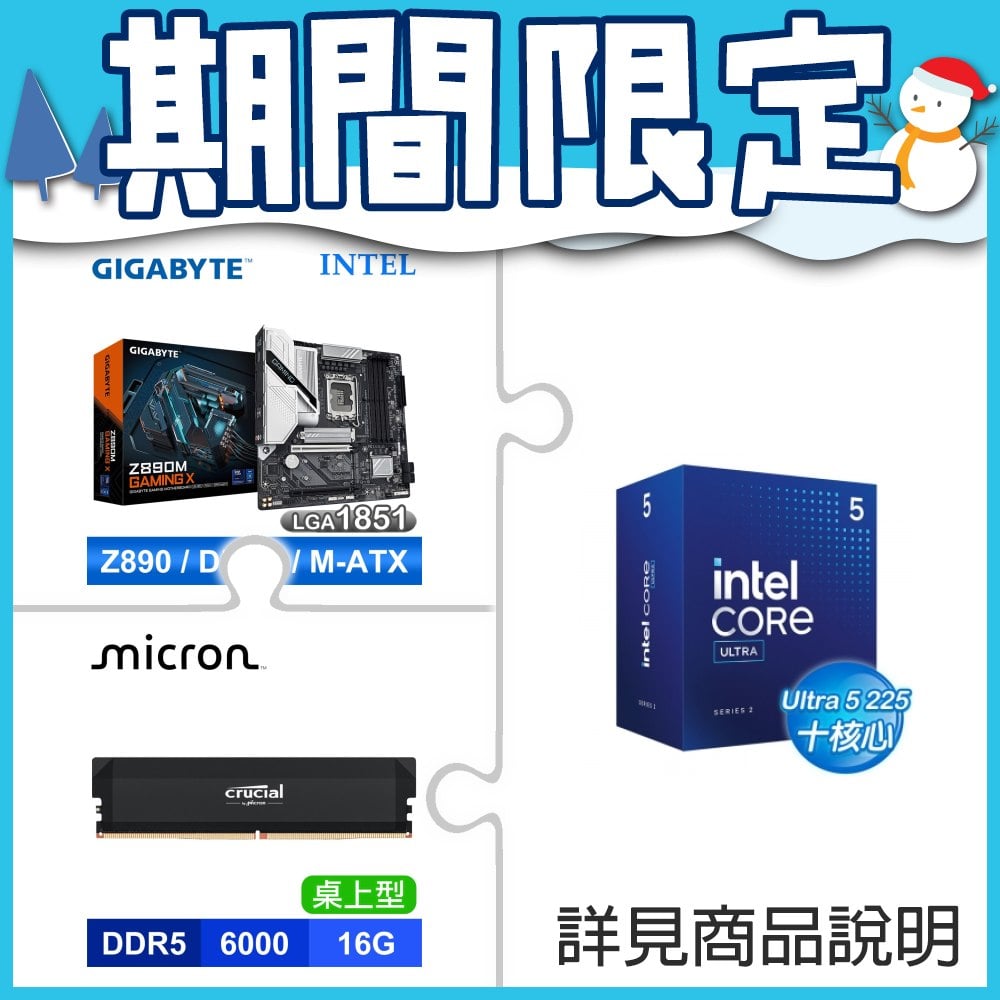 ☆期間限定★ Intel Core Ultra 5 225+技嘉 Z890M GAMING X D5 MATX主機板+美光 Crucial PRO DDR5 6000 16G 黑 CL36 黑 記憶體