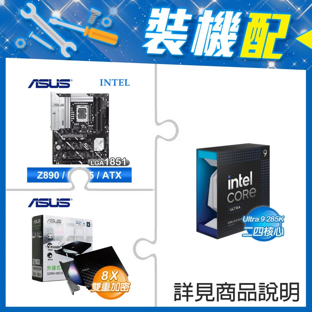 ☆裝機配★ Core U9 285K+華碩 Z890 MAX GAMING WIFI7 D5 ATX主機板+華碩 SDRW-08D2S-U 外接式燒錄機《黑》