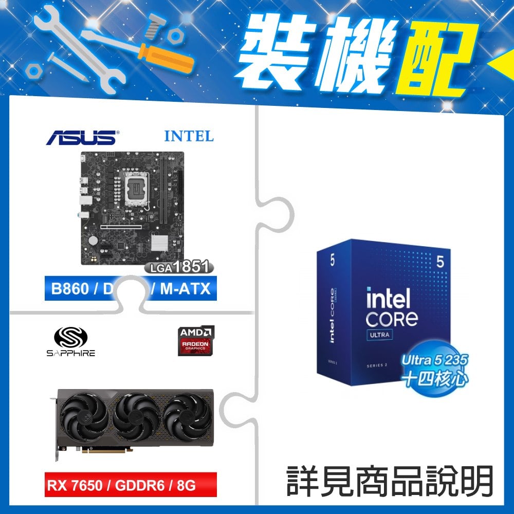 ☆裝機配★ Core U5 225F+華碩 B860M-E-CSM D5 MATX主機板+藍寶石 PULSE 白金版 RX 7650 GRE GAMING 8GB 顯示卡