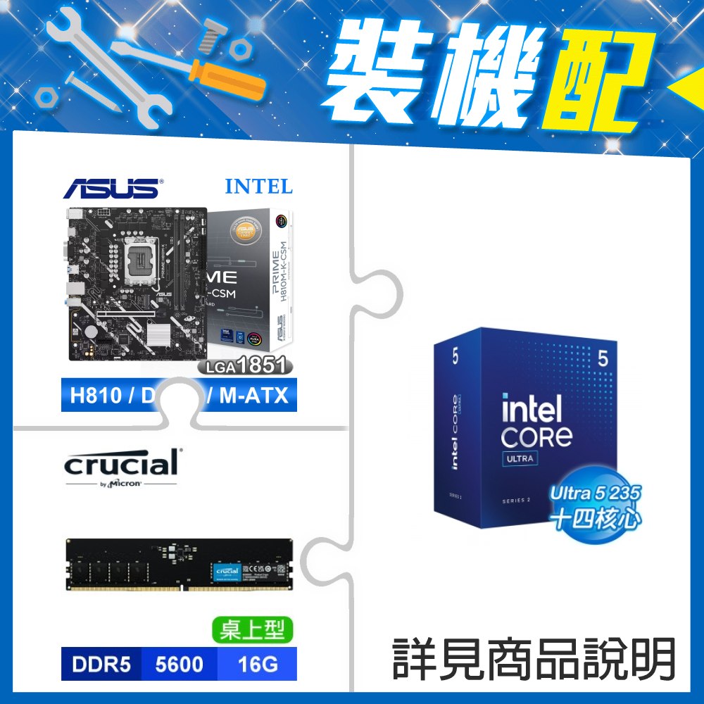 ☆裝機配★ Core U5 235+華碩 PRIME H810M-K-CSM D5 MATX主機板+美光 DDR5-5600 16G 記憶體